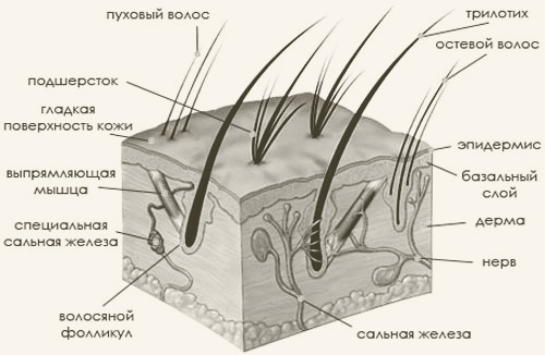 В коже кошки есть два основных слоя: эпидермис и дерма. Прочная эластичная дерма расположена под примерно 40 слоями отмерших клеток (собственно эпидермис) и 4 слоями живых клеток, составляющих базальный слой. В толще дермы находятся кровеносные капилляры, волосяные фолликулы, нервные окончания, которые проводят сигналы от волос и кожи, а также специальные сальные железы, реагирующие на нервные сигналы.