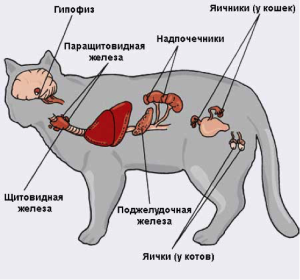 Эндокринная система у кошек и котов: гипофиз, щитовидная железа, паращитовидная железа, поджелудочная железа, надпочечники, яичники (у самок), яички (у самцов).