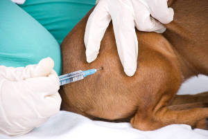 Для внутримышечных инъекций пользуются иглами с широким просветом и достаточной для этого длины. Диаметра просвета иглы опасаться не следует. Боль у собаки возникает только тогда, когда игла тупая или имеет шероховатость и зазубрины. Внутримышечные инъекции собаке чаще всего производят в хорошо развитую бедренную мышцу задней конечности. На собаку обязательно одевают намордник. При проведении этой инъекции необходим помощник, который удерживает собаку на боку, фиксируя ее заднюю конечность. Тот, кто делает инъекцию, выбирает место для укола, раздвигает шерсть, смачивает это место ватным тампоном с йодной настойкой или спиртом.
