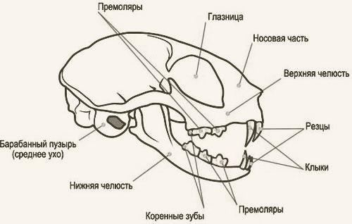 В верхней челюсти у кошки — 16, а в нижней — 14 постоянных зубов. Правильный прикус — клешеобразный: режущие поверхности резцов нижней и верхней челюстей упираются друг в друга, подобно клещам. При этом куски мяса режутся, как ножницами, а кости ломаются. Шесть зубов-резцов почти не используются при принятии пищи. Кошка разве что отрезает ими остатки мяса с толстой кости. А вот при уходе за кожей и мехом — они просто необходимы. На удивление ловко кошка выбирает ими блох из своей шкурки.