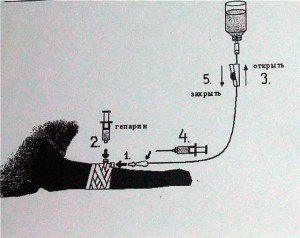 - Промойте катетер. Раствор для промывания катетера готовится следующим образом: берете шприц на 5 мл, набираете в него 0,5 мл гепарина, добираете в шприц 0,9 % NaCl (физраствор) до 5 мл. Для промывания катетера откройте верхний клапан катетера (2), подсоедините к нему шприц без иглы с раствором для промывания и введите 0,5 мл (не весь шприц, а 0,5 мл), закройте клапан. Если верхнего клапана в катетере нет, то промывание катетера осуществляется через канюлю для соединения с капельной системой (1).