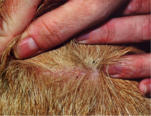 Постепенно пятно увеличивается в размерах, зуд может присутствовать или отсутствовать. В основном пораженные участки кожи находятся на ушах, голове или хвосте. Иногда наблюдается более вытянутая форма пятен, которая напоминает симптоматику аутоиммунных болезней.