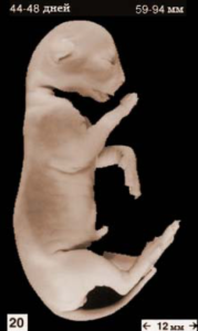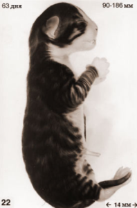 На 44 день размер плода увеличивается до 59 – 94мм, формируется шерсть, шелковистым слоем покрывая котёнка. С 48-го дня (65 – 125мм), шерсть насыщается пигментом, приобретает цвет. Наконец, с 58 дня начинается заключительный этап беременности кошки.